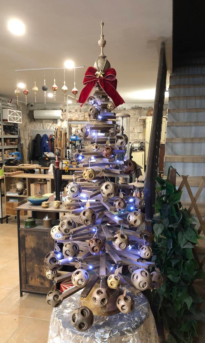 Sapin réalisé en chêne d'un siècle, décoré de boules de Canton de diamètre différent, 80, 65, 50, 40 et 32 mm en divers essences, Acajou, Erable Sycomore et de Montpellier, Noyer, Frêne Olivier, Poirier et Buis.